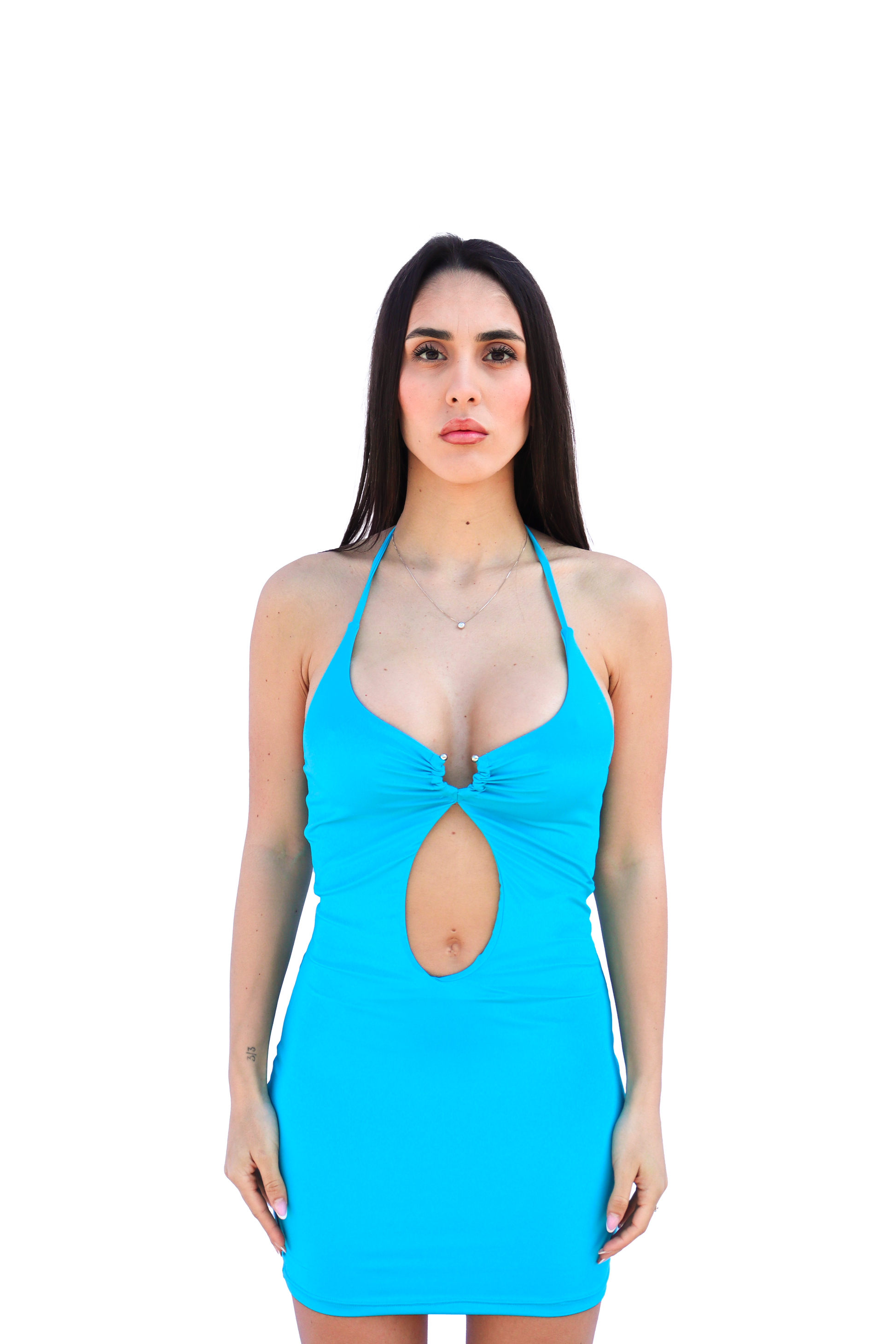 Un look che non passa inosservato. Questo vestito corto unisce sensualità e stile con un design moderno e deciso: il taglio frontale valorizza il décolleté, mentre il dettaglio in metallo a forma di ferro di cavallo dona un tocco bold e distintivo. Si lega delicatamente al collo, lasciando la schiena semi-scoperta per un effetto wow.