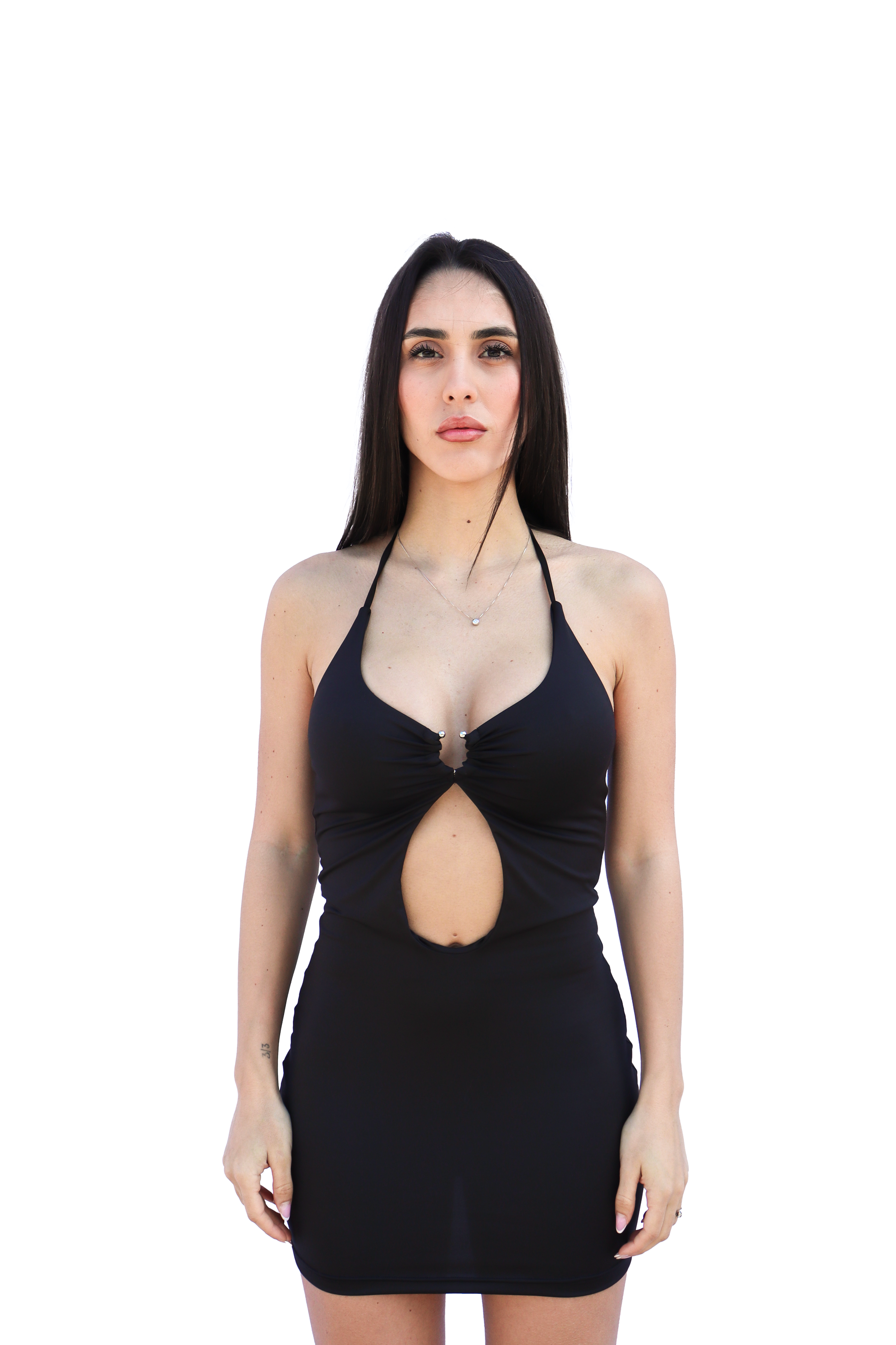 Un look che non passa inosservato. Questo vestito corto unisce sensualità e stile con un design moderno e deciso: il taglio frontale valorizza il décolleté, mentre il dettaglio in metallo a forma di ferro di cavallo dona un tocco bold e distintivo. Si lega delicatamente al collo, lasciando la schiena semi-scoperta per un effetto wow.