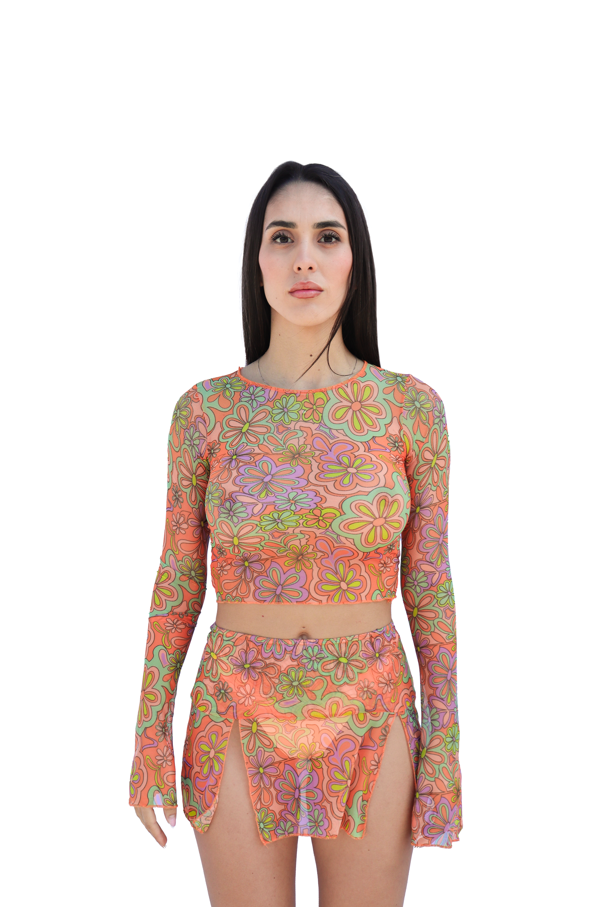La parte superiore è una maglia in tulle trasparente, leggerissima e ariosa, che lascia intravedere il costume sottostante per un effetto sensuale e sofisticato. Le maniche svasate aggiungono un tocco romantico e boho-chic, creando movimento ad ogni passo e accarezzando delicatamente le braccia.